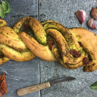 Sciogliete il lievito e lo zucchero nel latte tiepido Nel frattempo mescolate la farina, l'olio, le uova e il sale e impastate, aggiungete infine il latte con il lievito e continuate a lavorarlo fino ad ottenere un impasto liscio . Copritelo e lasciatelo lievitare fino al raddoppio in un posto tiepido ( io lo metto in forno spento con la luce accesa) Riprendete quindi l'impasto e dividetelo in due. Preriscaldate il forno a 200 g statico. Stendete con il matterello l'impasto formando un rettangolo che poi dividerò in due nel senso verticale . Al centro di ognuno mettete il pesto, i pomodorini e i pinoli. Chiudete sigillando i bordi e intrecciate tra di loro . Lasciate lievitare nella teglia foderata con carta da forno per un'altra mezz'ora . Spennellate con l'albume rimasto e infornate per 45 min.