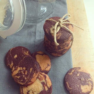 Tagliate il burro a pezzetti e lavoratelo con lo zucchero, aggiungete 250 gr di farina e impastate il tutto.Dividete l'impasto in de panetti, al primo aggiungete il cacao e impastate, al secondo i 20 gr di farina restante. mettete a riposare in frigo per un'ora. Trascorso il tempo, impastate velocemente i panetti mescolandoli e ricavatene un cilindro che, avvolto in pellicola, metterete in freezer per 15 min. Preriscaldate il forno a 180 gradi. tagliate dei dischi di circa un cm e metteteli ben distanziati in una teglia foderata da carta forno. Cuocete per 20 min.